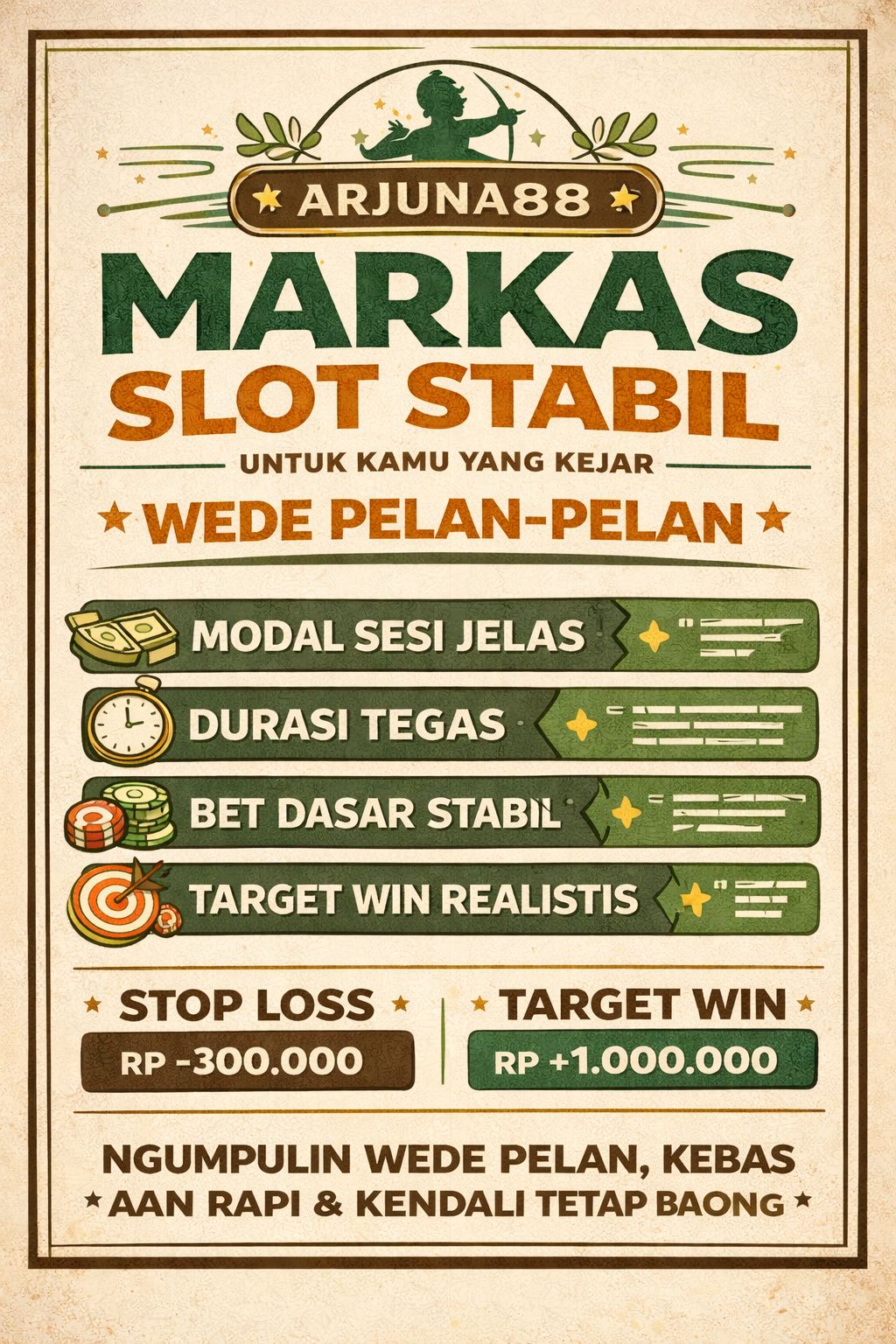 ARJUNA88: Markas Slot Stabil untuk Kamu yang Kejar Wede Pelan-Pelan adalah konsep bermain yang menempatkan stabilitas sebagai tujuan. Kamu bukan mengejar ledakan, tapi mengumpulkan hasil dengan cara yang rapi. Modal sesi jelas, durasi tegas, bet dasar stabil, checkpoint rutin, dan pintu keluar yang sehat membuat kamu bisa menikmati slot tanpa drama.